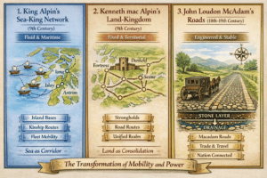 A companion enquiry into my paternal McAdam lineage traces Alpin maritime crossings and inland corridors — from Belfast along the Antrim Coast toward Kintyre, Islay, and Mull — exploring how engineered routes, glens, and later macadamised roads have shaped systems thinking across generations.